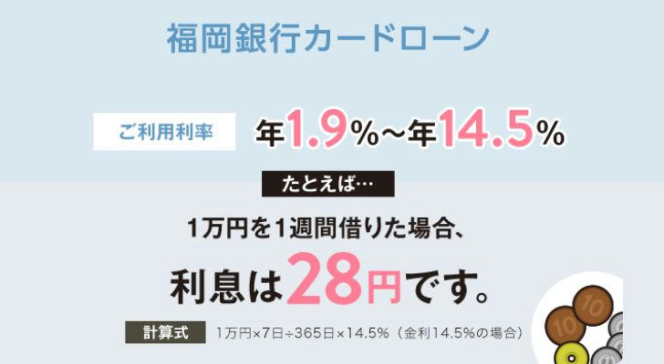 | FFGカードローン | 20~69歳 | 10万~1000万円 | 年1.9~14.5% | 高額融資可能 | 地域制限あり |