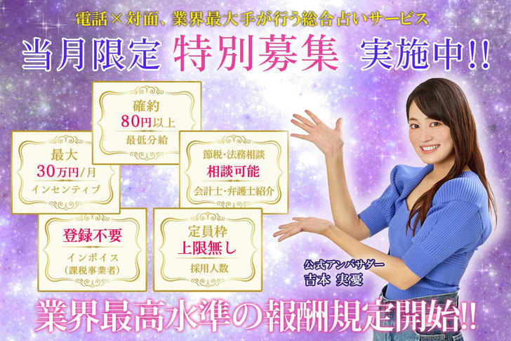 ・性別/年齢不問 ・礼儀がしっかりしている ・占術の基礎がある ・利用者に寄り添える人